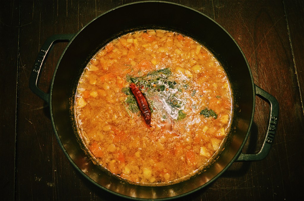 - Cook toor dal in a pressure cooker, with 3 cups of water, until soft (around 15 minutes on high pressure), mash until smooth, and set aside